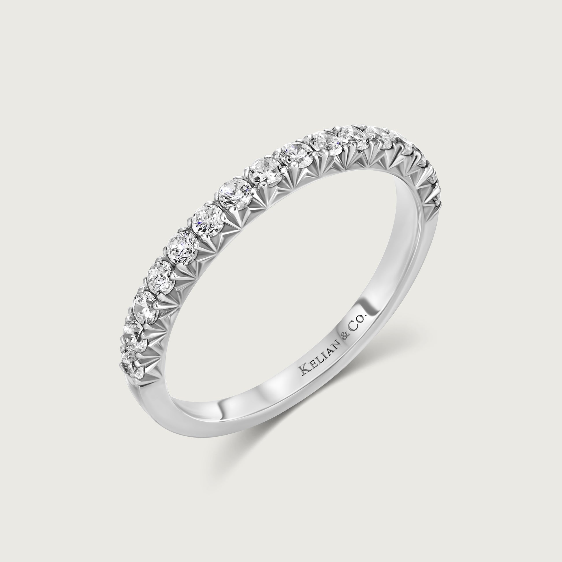 The French pavé technique, renowned for its artistry and precision, allows each stone to capture light from multiple angles, creating a soft, radiant glow that wraps seamlessly around the band.