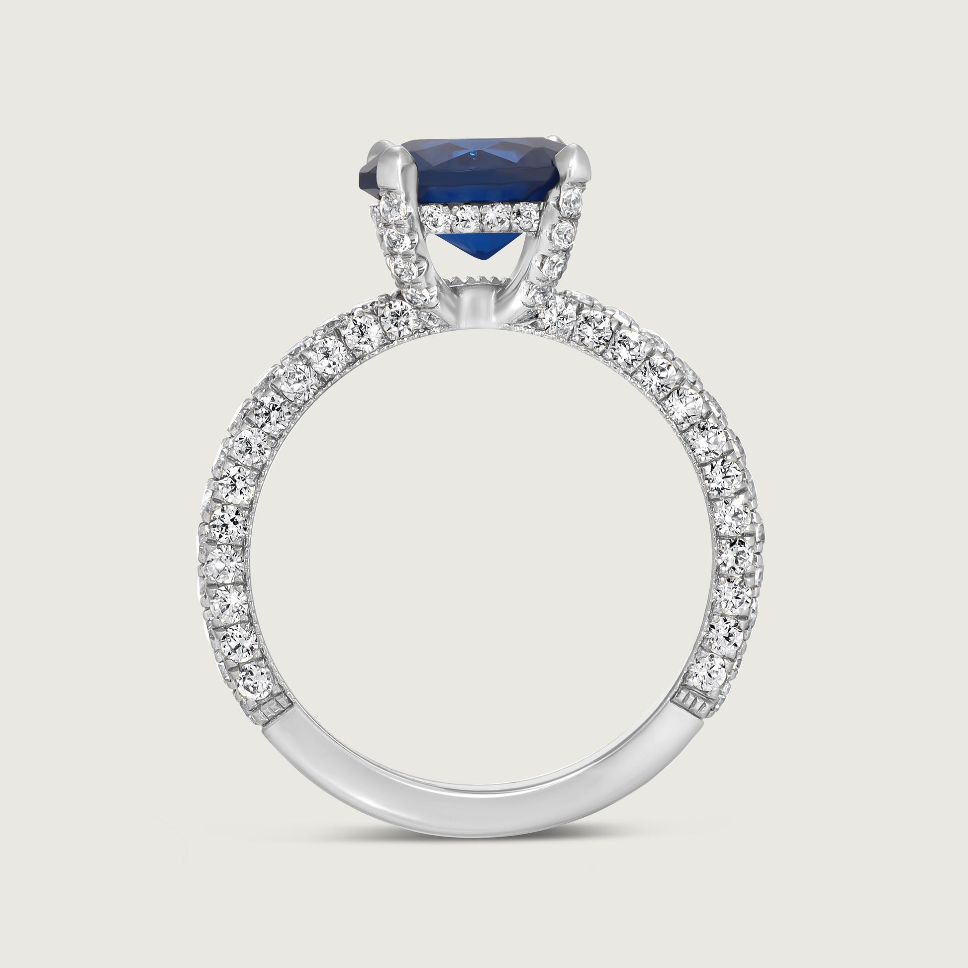 A captivating design that celebrates timeless elegance, this ring features a vivid sapphire embraced by 72 round brilliant-cut diamonds, totaling 3.88 carats. Crafted in 18K white gold (750/1000), it radiates sophistication and grace.